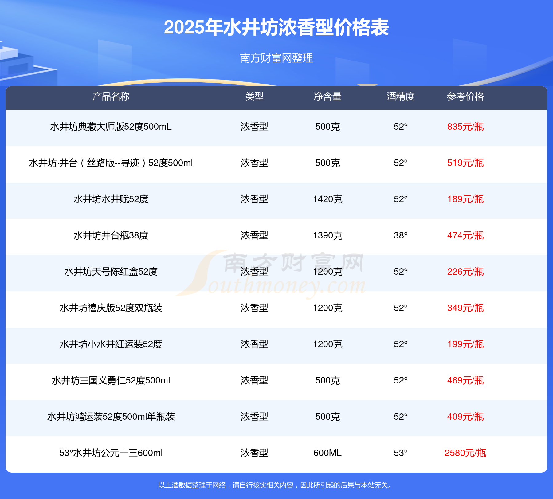 2025年水井坊濃香型酒水井坊大壇收藏級原漿天球瓶66度、水井坊博物館壹號53度雙瓶裝、53°水井坊公元十三600ml、水井坊梅蘭竹菊52度濃香型600ml4瓶、水井坊菁翠52度500ml、井臺珍藏版龍53度1000ml單瓶裝等最新價格如下: