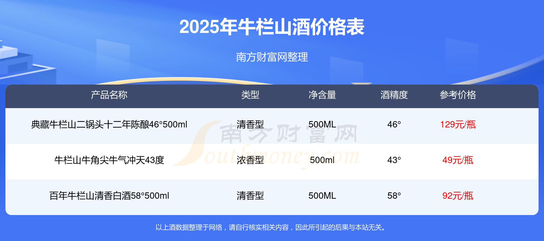 2025年,典藏牛欄山二鍋頭十二年陳釀46°500ml、百年牛欄山清香白酒58°500ml、牛欄山牛角尖牛氣沖天43度等牛欄山酒價(jià)格如下:典藏牛欄山二鍋頭十二年陳釀46°500ml參考價(jià)129元/瓶、百年牛欄山清香白酒58°500ml參考價(jià)92元/瓶、牛欄山牛角尖牛氣沖天43度參考價(jià)49元/瓶。