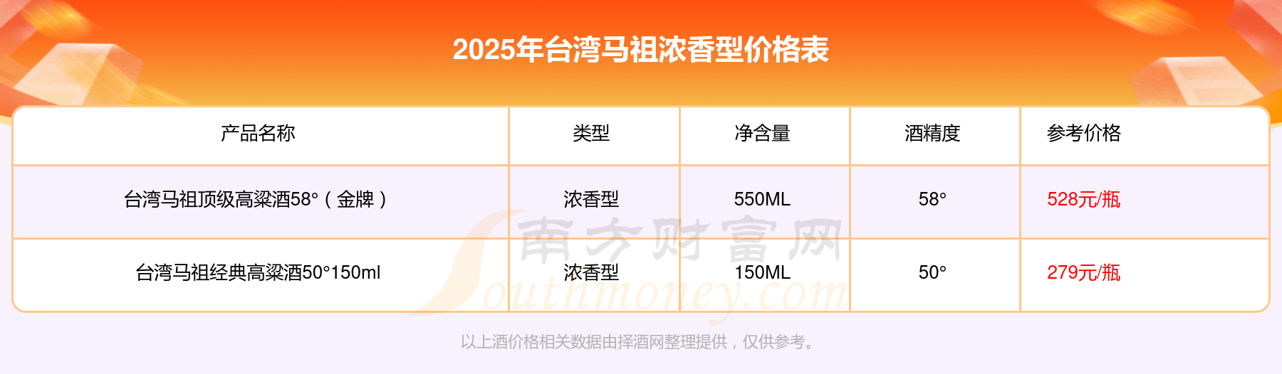 臺灣馬祖頂級高粱酒58°(金牌)參考價528元/瓶、臺灣馬祖經典高粱酒50°150ml參考價279元/瓶。