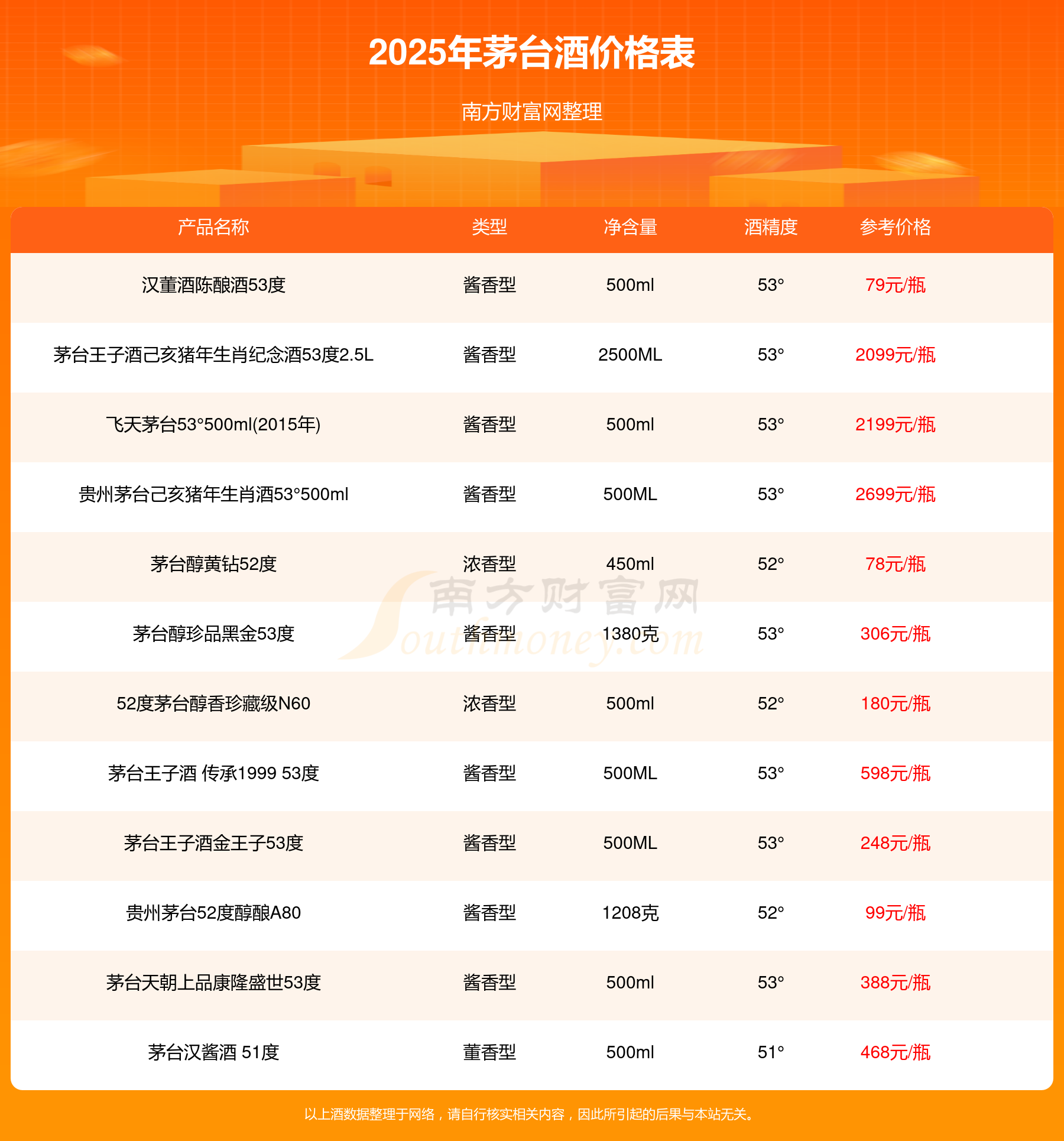 2025茅臺酒最新價格:華茅鑒藏 醬香型白酒 3L 53°參考價8388元/瓶、53度五星茅臺生肖酒丁酉雞年參考價2798元/瓶、貴州茅臺己亥豬年生肖酒53°500ml參考價2699元/瓶、53度五星茅臺生肖酒戊戌狗年參考價2698元/瓶、飛天茅臺53°500ml(2015年)參考價2199元/瓶、茅臺王子酒己亥豬年生肖紀(jì)念酒53度2.5L參考價2099元/瓶。