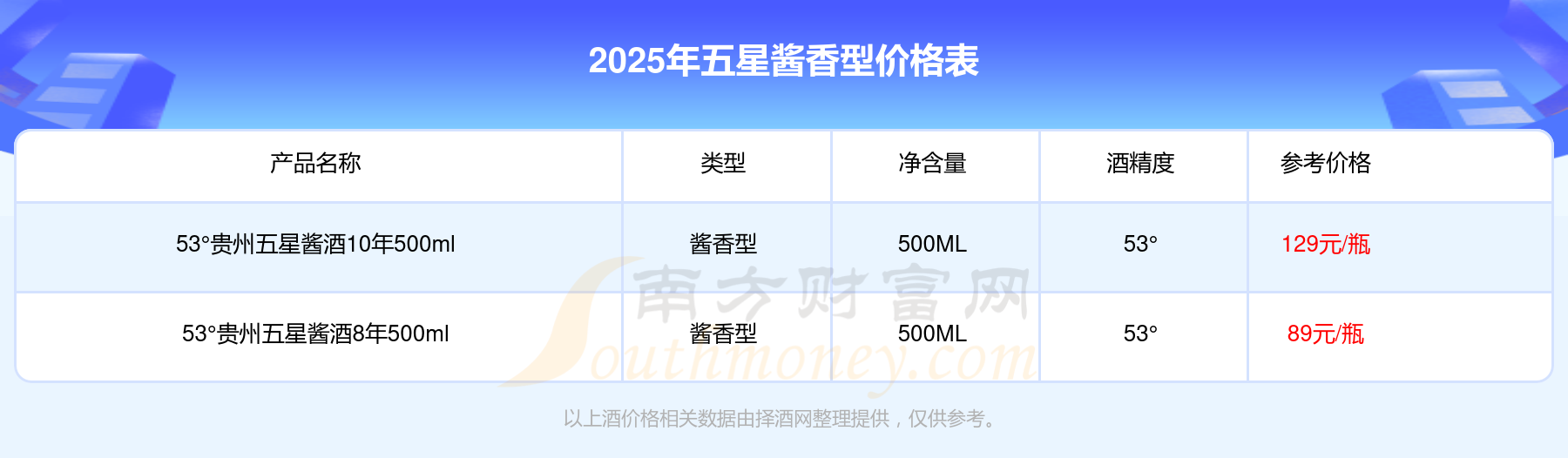 2025年,53°貴州五星醬酒10年500ml、53°貴州五星醬酒8年500ml等五星醬香型酒價(jià)格如下:
