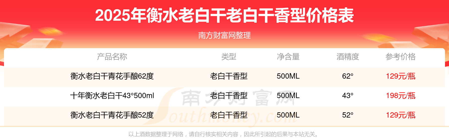 衡水老白干老白干香型酒最新價(jià)格2025:十年衡水老白干43°500ml參考價(jià)198元/瓶、衡水老白干青花手釀52度參考價(jià)129元/瓶、衡水老白干青花手釀62度參考價(jià)129元/瓶。