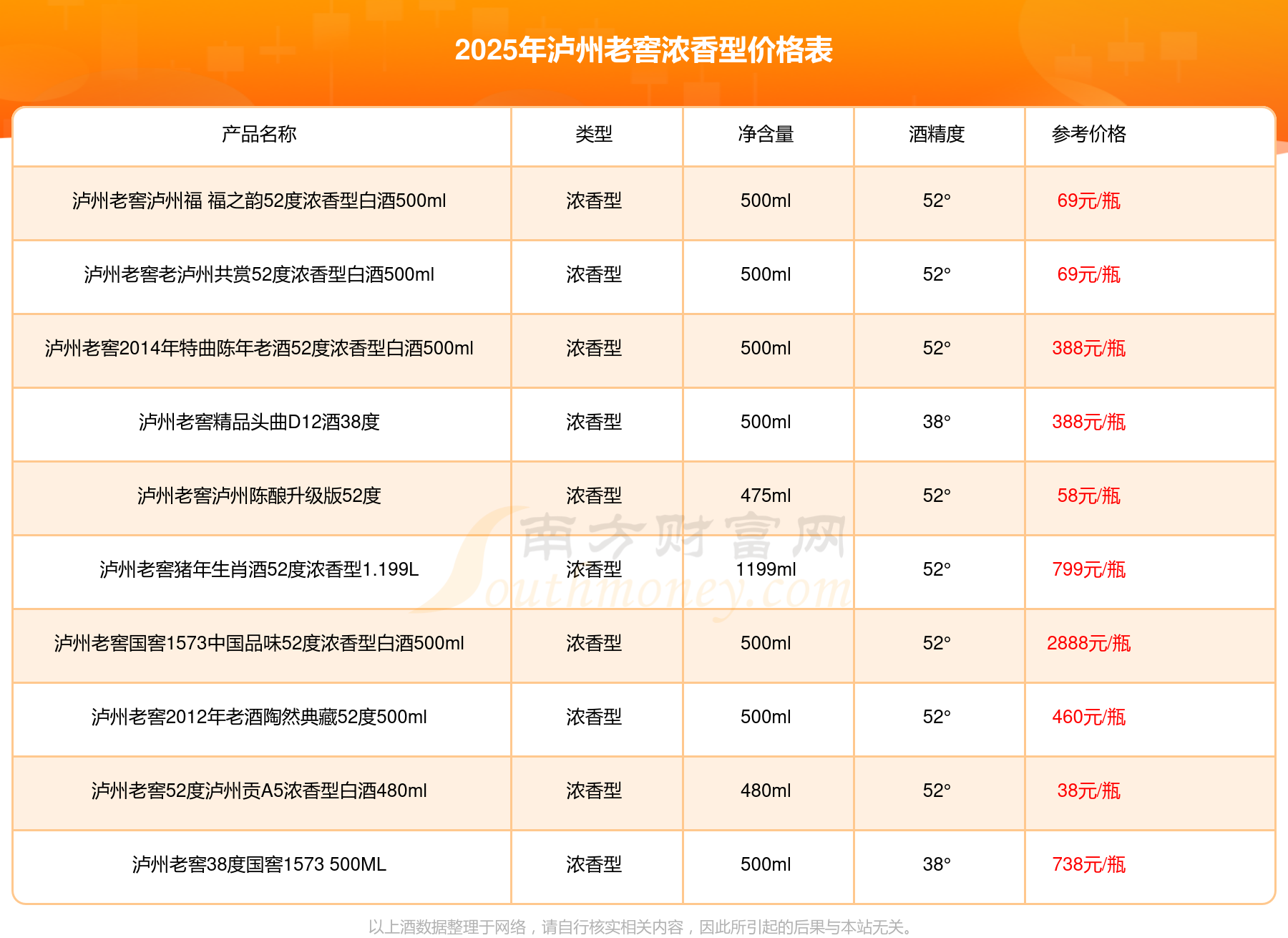 瀘州老窖濃香型酒最新價(jià)格2025:瀘州老窖國窖1573春釀鼠兆豐年E 55度參考價(jià)17999元/瓶、瀘州老窖國窖1573生命中的那壇酒55度014參考價(jià)9999元/瓶、瀘州老窖國窖1573春釀鼠兆豐年A 55度參考價(jià)5088元/瓶、瀘州老窖國窖1573生命中的那壇酒55度013濃香型白酒1000ml參考價(jià)4988元/瓶、瀘州老窖國窖1573生命中的那壇酒55度009 1000ml參考價(jià)4288元/瓶、瀘州老窖國窖1573中國品味52度濃香型白酒500ml參考價(jià)2888元/瓶。