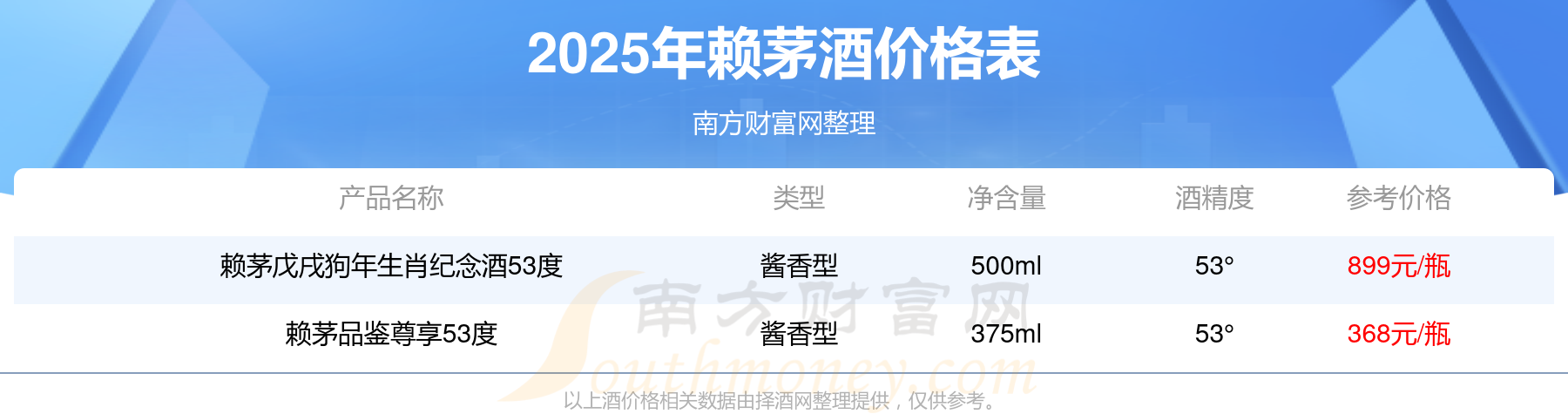 賴茅酒最新價格2025:賴茅戊戌狗年生肖紀(jì)念酒53度參考價899元/瓶、賴茅品鑒尊享53度參考價368元/瓶。