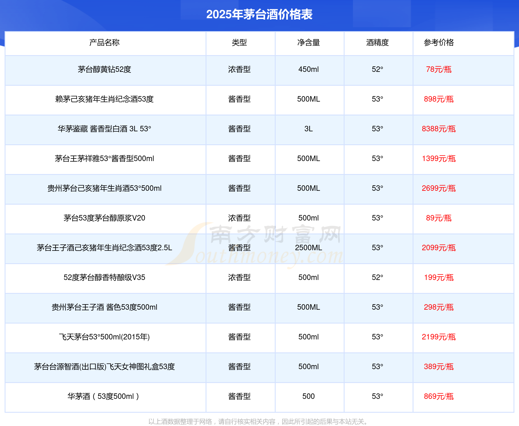 2025年茅臺(tái)酒華茅鑒藏 醬香型白酒 3L 53°、53度五星茅臺(tái)生肖酒丁酉雞年、貴州茅臺(tái)己亥豬年生肖酒53°500ml、53度五星茅臺(tái)生肖酒戊戌狗年等最新價(jià)格如下:華茅鑒藏 醬香型白酒 3L 53°參考價(jià)8388元/瓶、53度五星茅臺(tái)生肖酒丁酉雞年參考價(jià)2798元/瓶、貴州茅臺(tái)己亥豬年生肖酒53°500ml參考價(jià)2699元/瓶、53度五星茅臺(tái)生肖酒戊戌狗年參考價(jià)2698元/瓶。