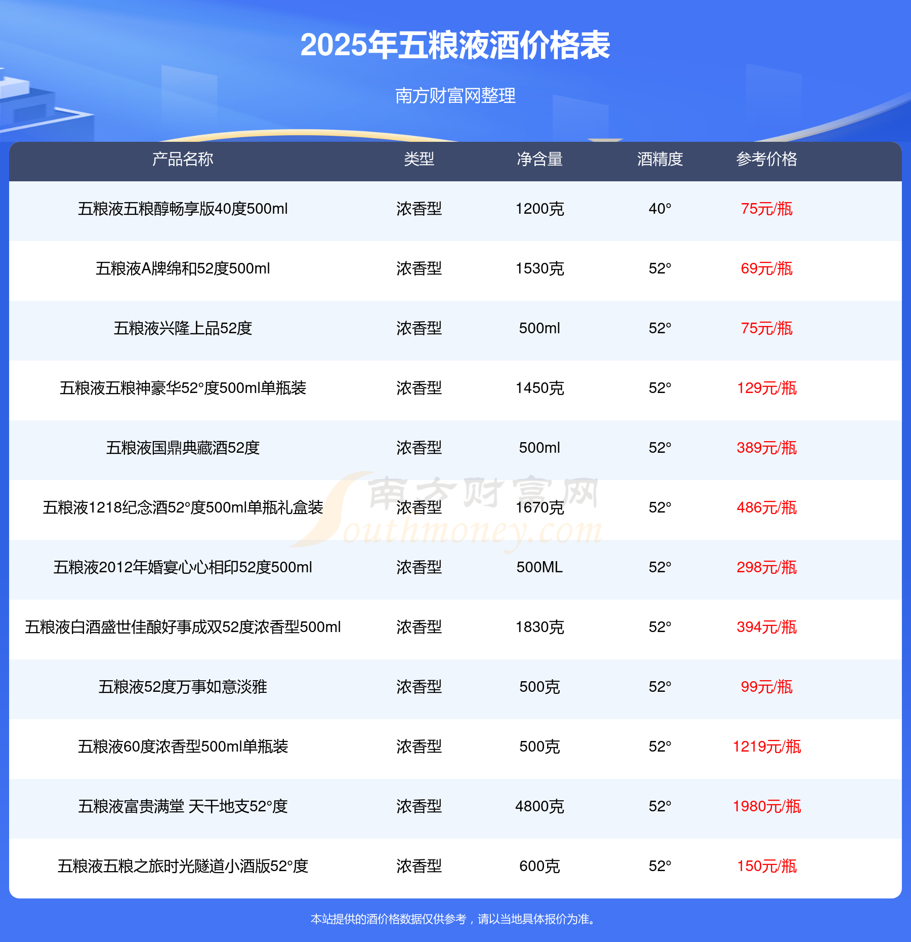 五糧液酒價格最高的是五糧液百年世博世紀(jì)榮耀紀(jì)念酒60°999ml,參考價26980元/瓶,最低的是五糧液干一杯小瓶46度,參考價16元/瓶,價格高低差為26964元/瓶。