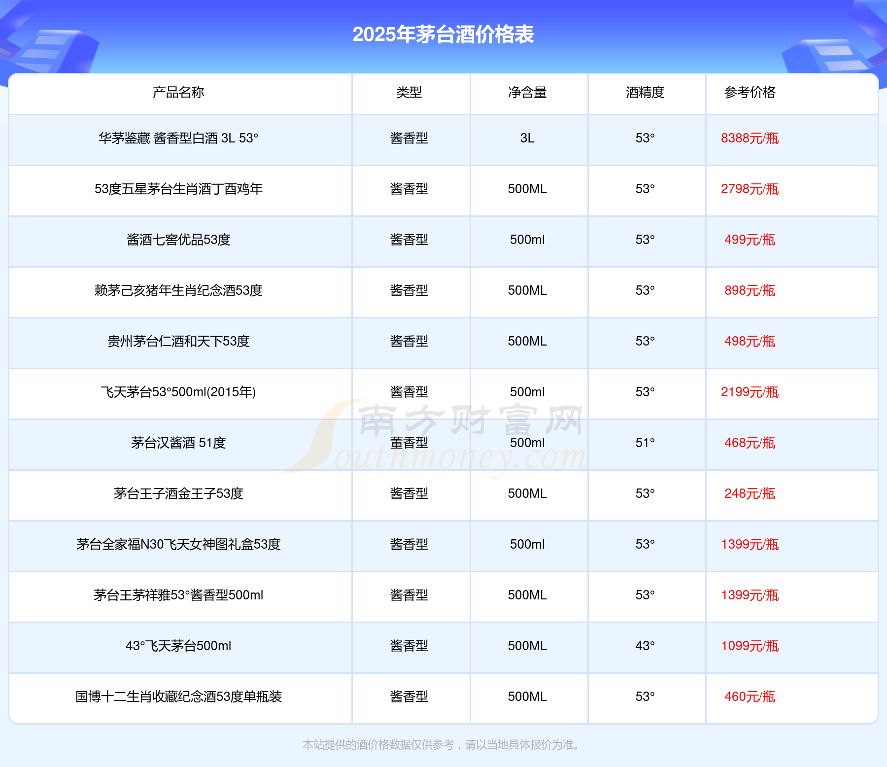 茅臺(tái)酒最新價(jià)格2025:華茅鑒藏 醬香型白酒 3L 53°參考價(jià)8388元/瓶、53度五星茅臺(tái)生肖酒丁酉雞年參考價(jià)2798元/瓶、貴州茅臺(tái)己亥豬年生肖酒53°500ml參考價(jià)2699元/瓶、53度五星茅臺(tái)生肖酒戊戌狗年參考價(jià)2698元/瓶、飛天茅臺(tái)53°500ml(2015年)參考價(jià)2199元/瓶、茅臺(tái)王子酒己亥豬年生肖紀(jì)念酒53度2.5L參考價(jià)2099元/瓶、茅臺(tái)1935醬香型53度參考價(jià)1799元/瓶。