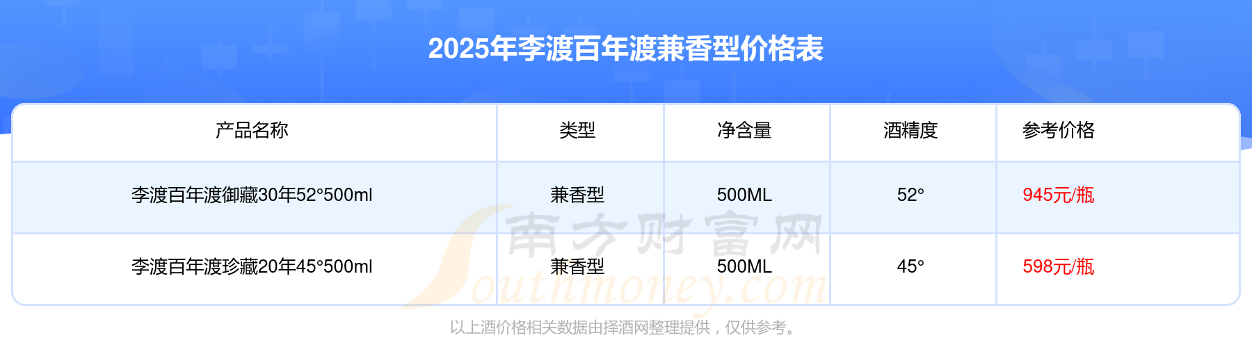 李渡百年渡兼香型酒最新價(jià)格2025:李渡百年渡御藏30年52°500ml參考價(jià)945元/瓶、李渡百年渡珍藏20年45°500ml參考價(jià)598元/瓶。