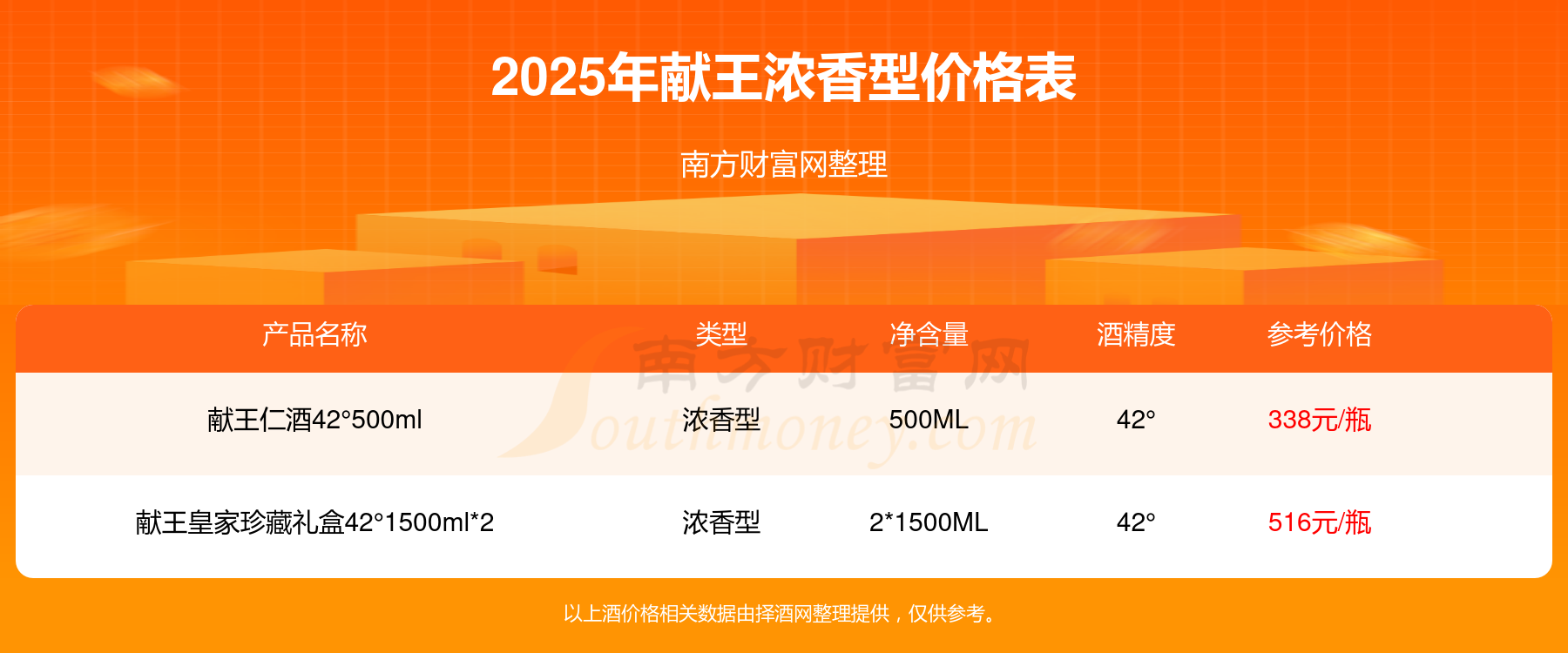 獻(xiàn)王皇家珍藏禮盒42°1500ml*2參考價(jià)516元/瓶、獻(xiàn)王仁酒42°500ml參考價(jià)338元/瓶。