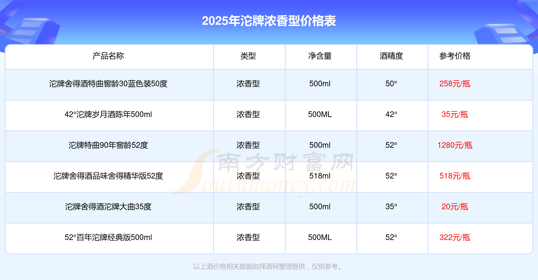 2025年沱牌濃香型酒沱牌特曲90年窖齡52度、沱牌舍得酒品味舍得精華版52度、52°百年沱牌經(jīng)典版500ml、沱牌舍得酒特曲窖齡30藍色裝50度等最新價格如下: