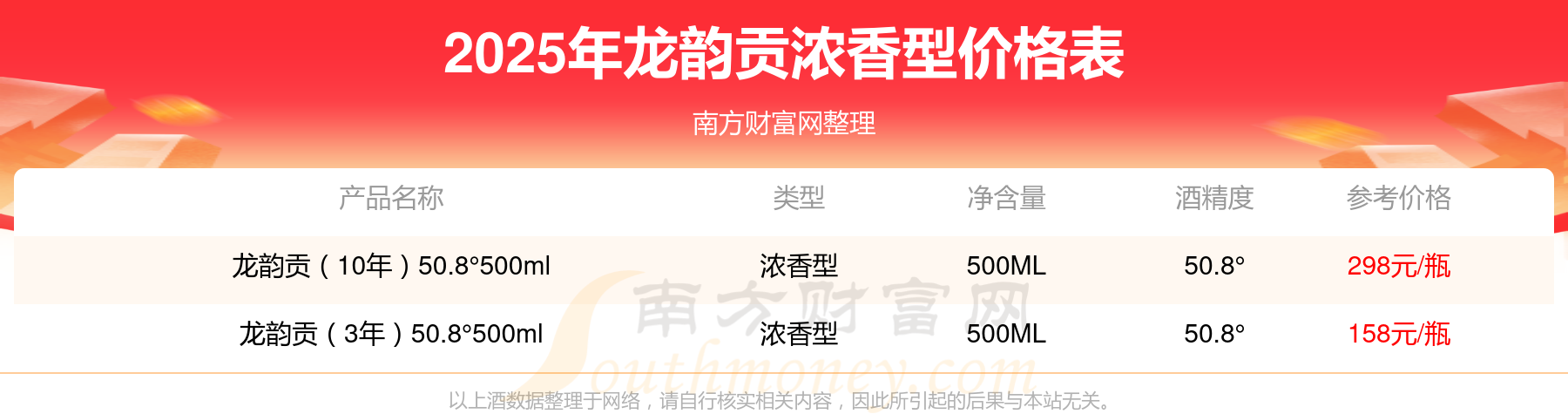 2025年,龍韻貢濃香型酒價格最高的是龍韻貢(10年)50.8°500ml,參考價298元,最低的是龍韻貢(3年)50.8°500ml,參考價158元,價格高低差為140元。