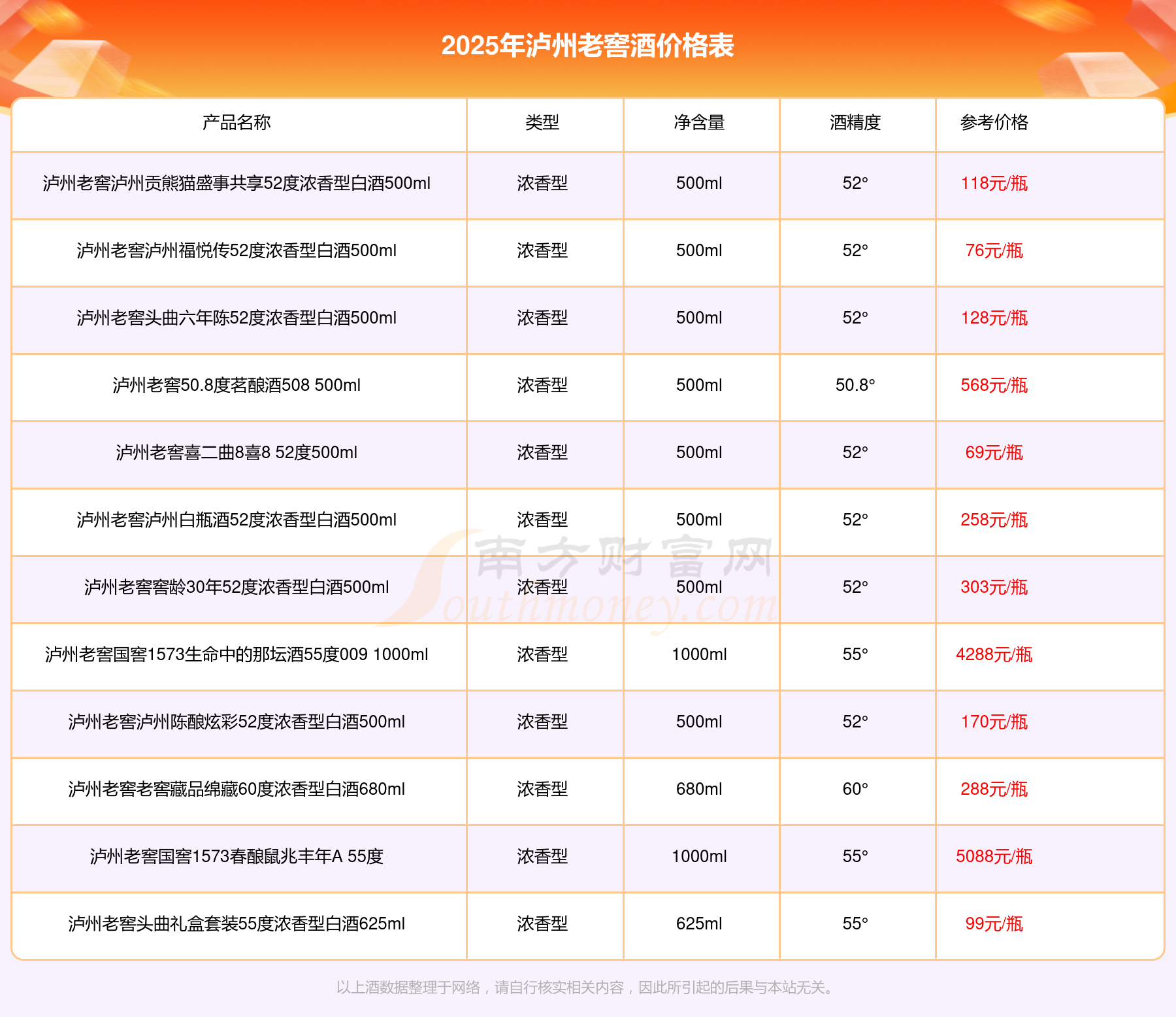 2025年,瀘州老窖國窖1573春釀鼠兆豐年E 55度、瀘州老窖國窖1573生命中的那壇酒55度014、瀘州老窖國窖1573春釀鼠兆豐年A 55度、瀘州老窖國窖1573生命中的那壇酒55度013濃香型白酒1000ml、瀘州老窖國窖1573生命中的那壇酒55度009 1000ml、瀘州老窖國窖1573中國品味52度濃香型白酒500ml等瀘州老窖酒價格如下:瀘州老窖國窖1573春釀鼠兆豐年E 55度參考價17999元/瓶、瀘州老窖國窖1573生命中的那壇酒55度014參考價9999元/瓶、瀘州老窖國窖1573春釀鼠兆豐年A 55度參考價5088元/瓶、瀘州老窖國窖1573生命中的那壇酒55度013濃香型白酒1000ml參考價4988元/瓶、瀘州老窖國窖1573生命中的那壇酒55度009 1000ml參考價4288元/瓶、瀘州老窖國窖1573中國品味52度濃香型白酒500ml參考價2888元/瓶。