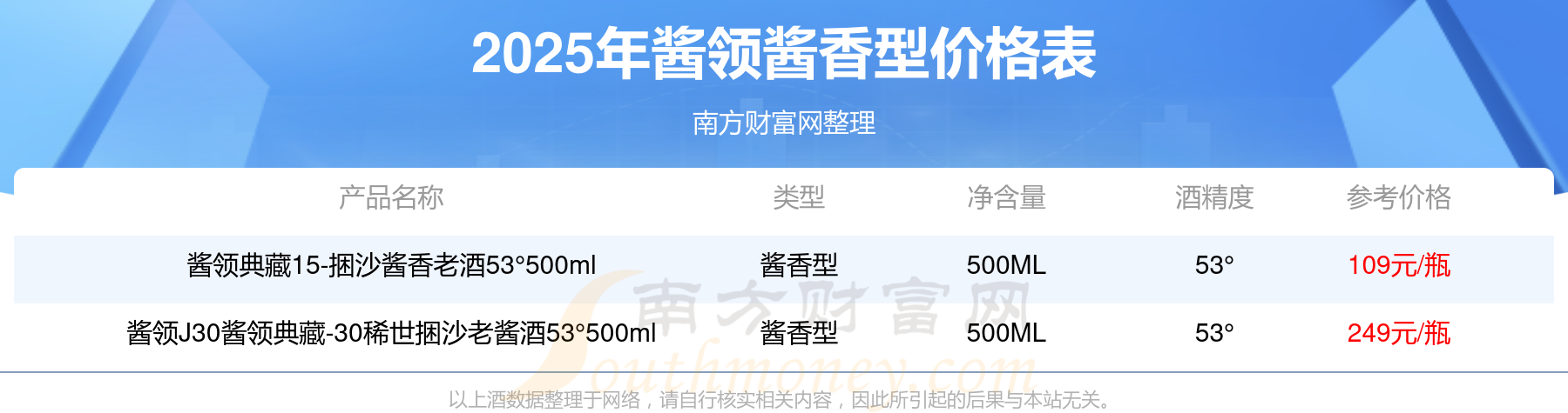 2025醬領(lǐng)醬香型酒最新價格:醬領(lǐng)J30醬領(lǐng)典藏-30稀世捆沙老醬酒53°500ml參考價249元/瓶、醬領(lǐng)典藏15-捆沙醬香老酒53°500ml參考價109元/瓶。