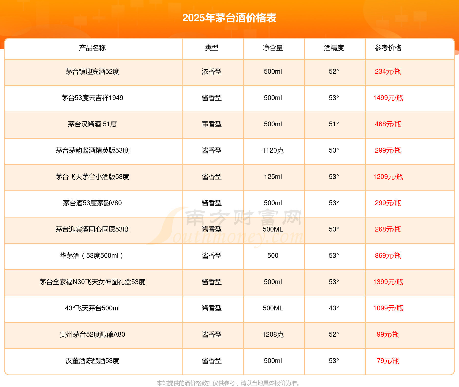 2025茅臺(tái)酒最新價(jià)格:華茅鑒藏 醬香型白酒 3L 53°參考價(jià)8388元/瓶、53度五星茅臺(tái)生肖酒丁酉雞年參考價(jià)2798元/瓶、貴州茅臺(tái)己亥豬年生肖酒53°500ml參考價(jià)2699元/瓶、53度五星茅臺(tái)生肖酒戊戌狗年參考價(jià)2698元/瓶、飛天茅臺(tái)53°500ml(2015年)參考價(jià)2199元/瓶、茅臺(tái)王子酒己亥豬年生肖紀(jì)念酒53度2.5L參考價(jià)2099元/瓶、茅臺(tái)1935醬香型53度參考價(jià)1799元/瓶。
