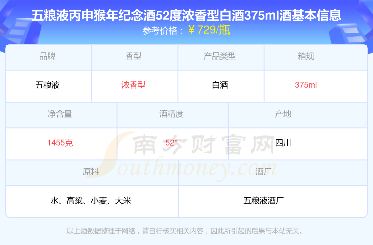五糧液丙申猴年紀念酒52度濃香型白酒375ml基本信息