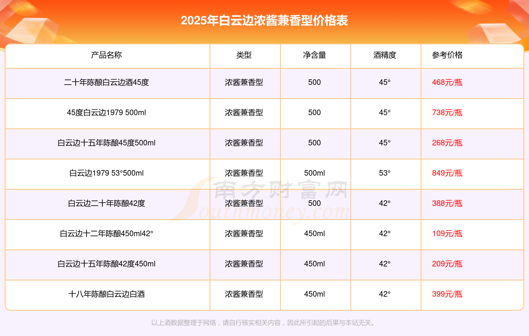 2025年,白云邊1979 53°500ml、45度白云邊1979 500ml、二十年陳釀白云邊酒45度、十八年陳釀白云邊白酒等白云邊濃醬兼香型酒價(jià)格如下:白云邊1979 53°500ml參考價(jià)849元/瓶、45度白云邊1979 500ml參考價(jià)738元/瓶、二十年陳釀白云邊酒45度參考價(jià)468元/瓶、十八年陳釀白云邊白酒參考價(jià)399元/瓶。