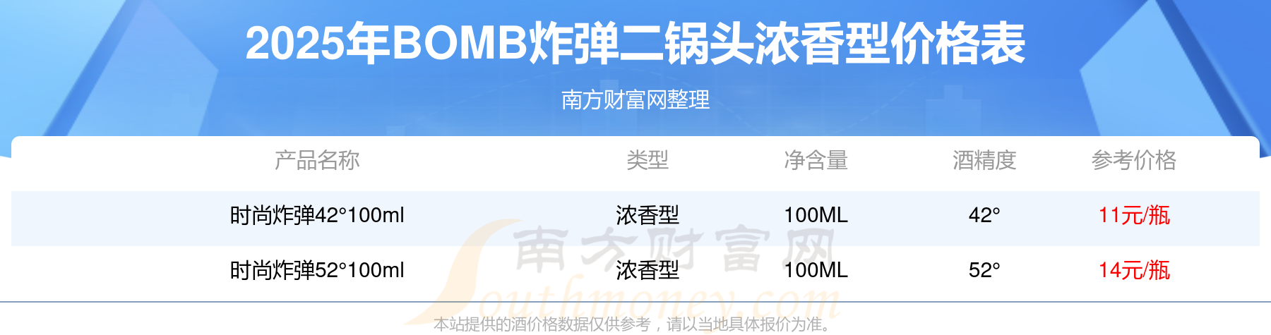 2025年,BOMB炸彈二鍋頭濃香型酒價格最高的是時尚炸彈52°100ml,參考價14元,最低的是時尚炸彈42°100ml,參考價11元,價格高低差為3元。
