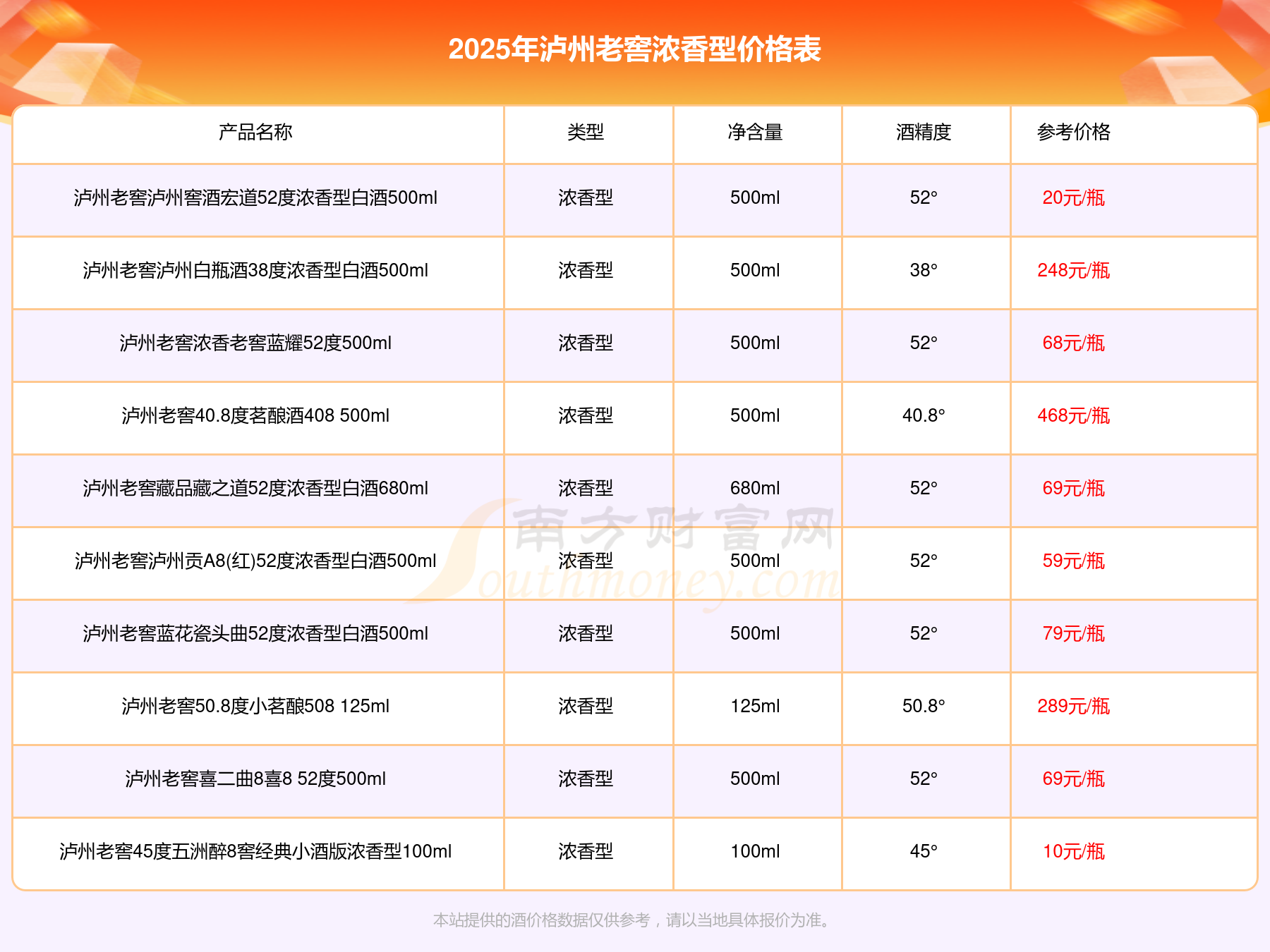 2025年,瀘州老窖濃香型酒價(jià)格最高的是瀘州老窖國窖1573春釀鼠兆豐年E 55度,參考價(jià)17999元,最低的是瀘州老窖45度五洲醉8窖經(jīng)典小酒版濃香型100ml,參考價(jià)10元,價(jià)格高低差為17989元。
