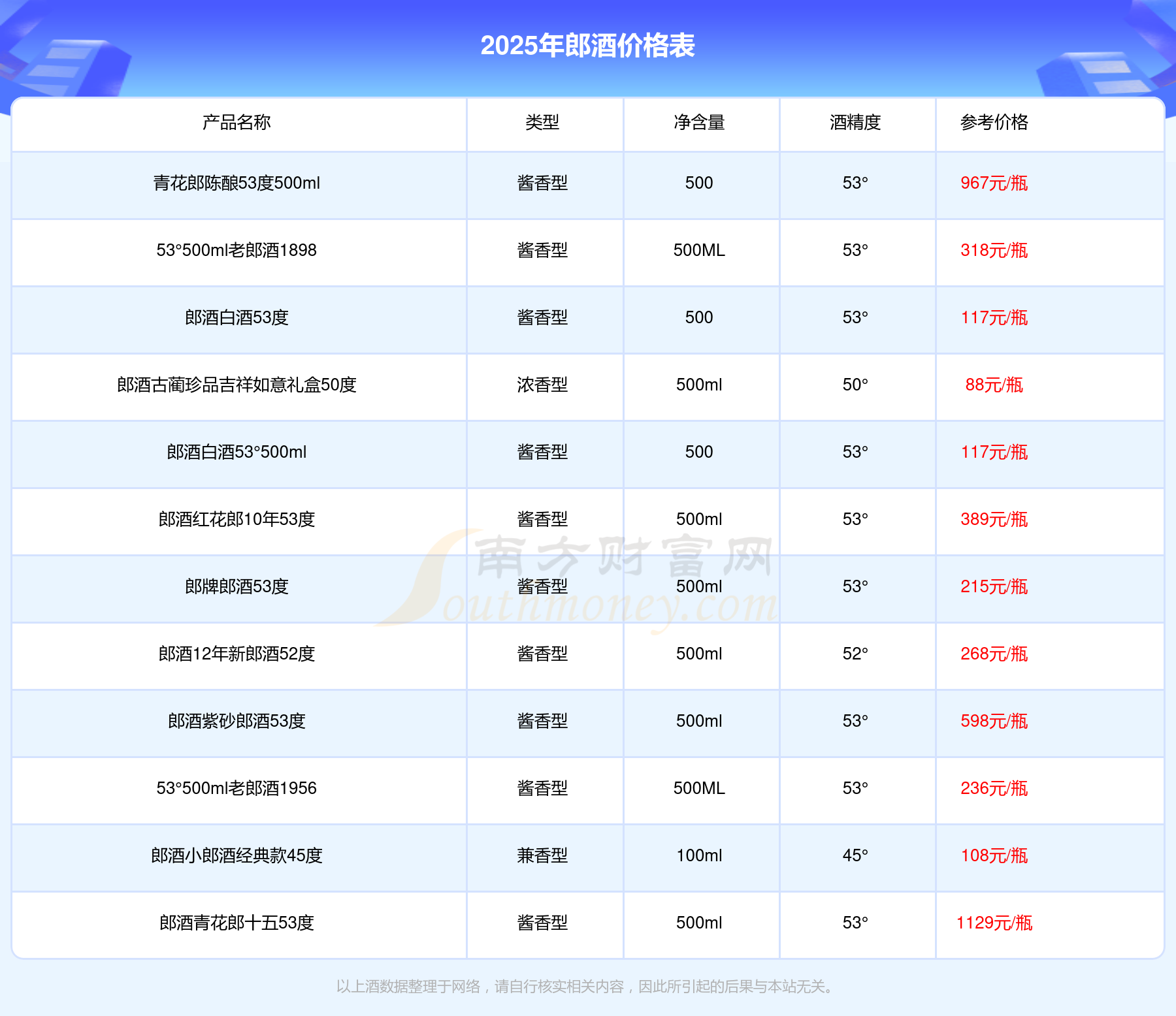 郎酒青花郎十五53度參考價(jià)1129元/瓶、青花郎陳釀53度500ml參考價(jià)967元/瓶、郎酒紫砂郎酒53度參考價(jià)598元/瓶。