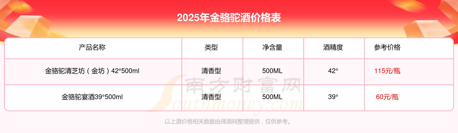 金駱駝清芝坊(金坊)42°500ml參考價(jià)115元/瓶、金駱駝宴酒39°500ml參考價(jià)60元/瓶。