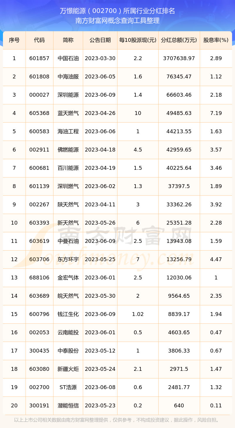 按照南方財(cái)富網(wǎng)趨勢選股系統(tǒng)統(tǒng)計(jì),萬憬能源所屬行業(yè)為天然氣行業(yè),天然氣行業(yè)分紅排名情況如下表: