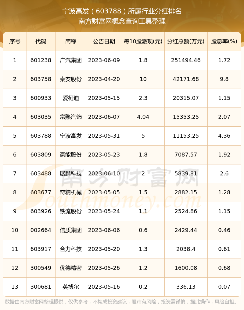 二、寧波高發(fā)603788行業(yè)分紅排名