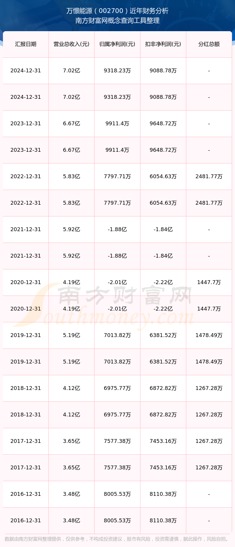 萬憬能源歷年分紅派息情況如下表所示: