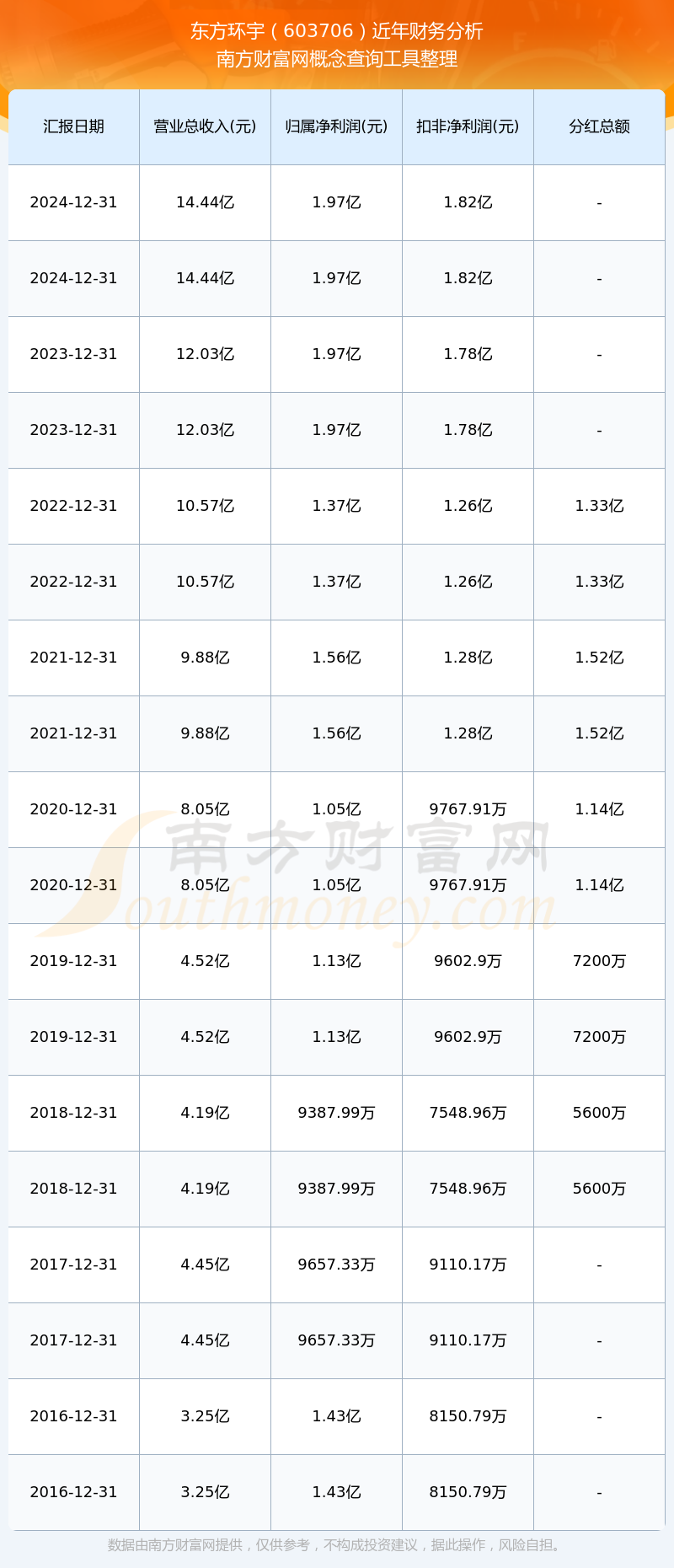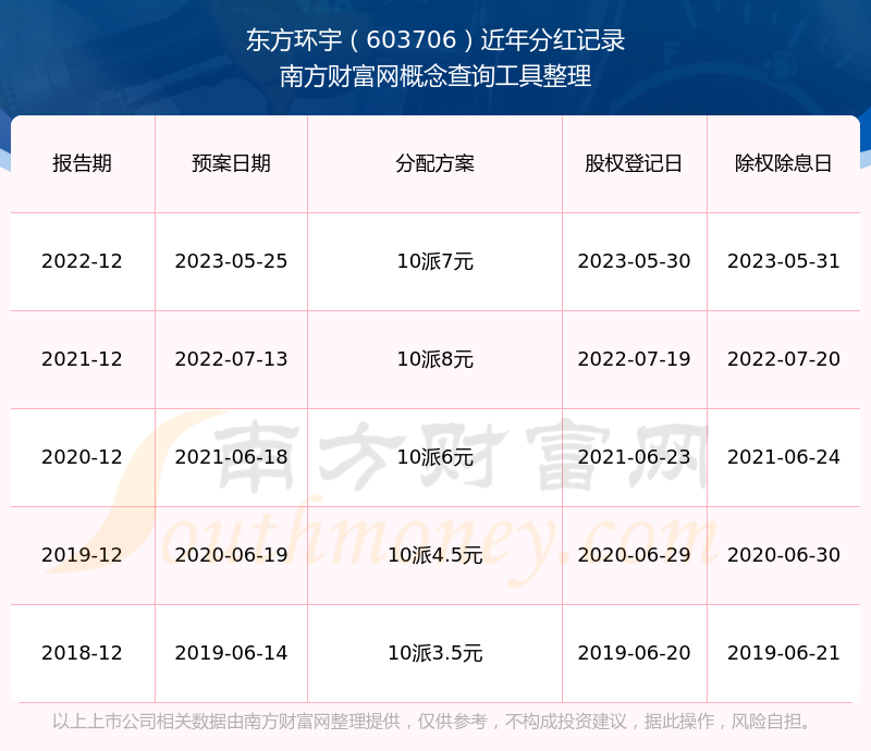 近年東方環(huán)宇分紅派息情況如下表所示: