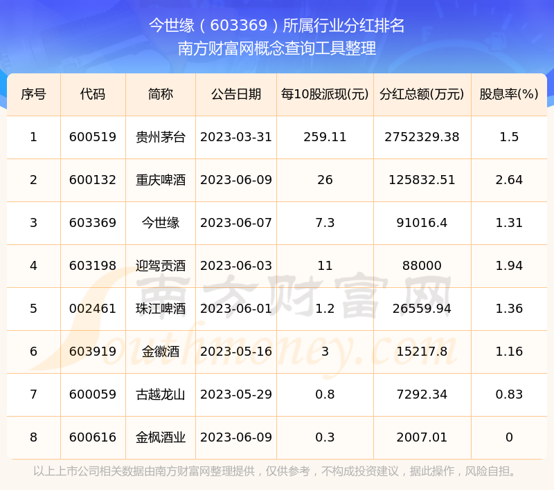 按照南方財(cái)富網(wǎng)趨勢(shì)選股系統(tǒng)統(tǒng)計(jì),今世緣所屬行業(yè)為釀酒行業(yè)行業(yè),釀酒行業(yè)行業(yè)分紅排名情況如下表:
