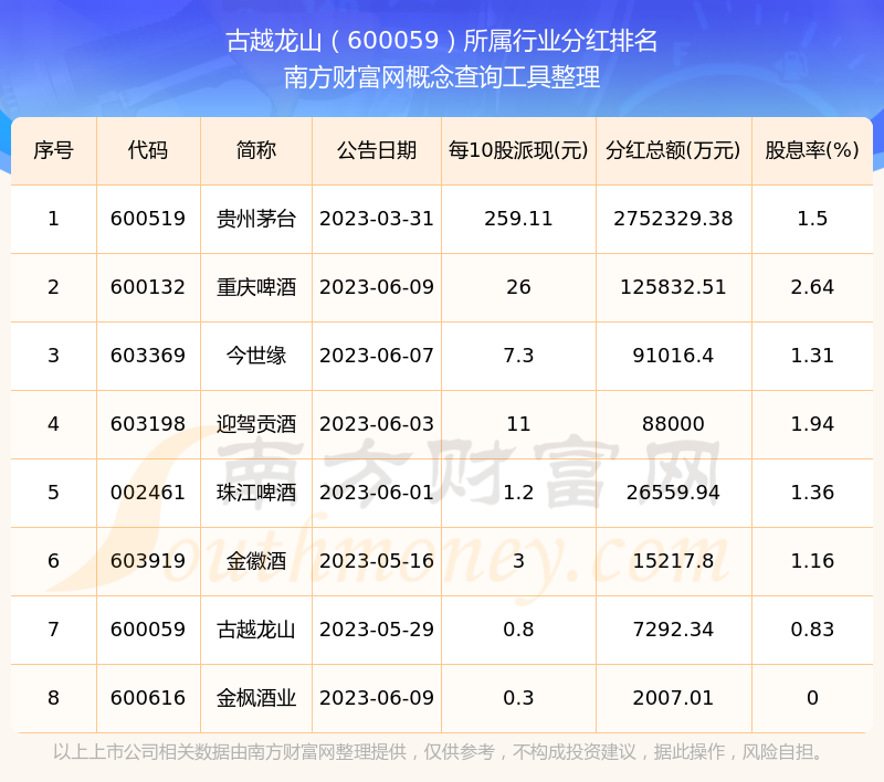 按照南方財(cái)富網(wǎng)趨勢(shì)選股系統(tǒng)統(tǒng)計(jì),古越龍山所屬行業(yè)為釀酒行業(yè)行業(yè),釀酒行業(yè)行業(yè)分紅排名情況如下表: