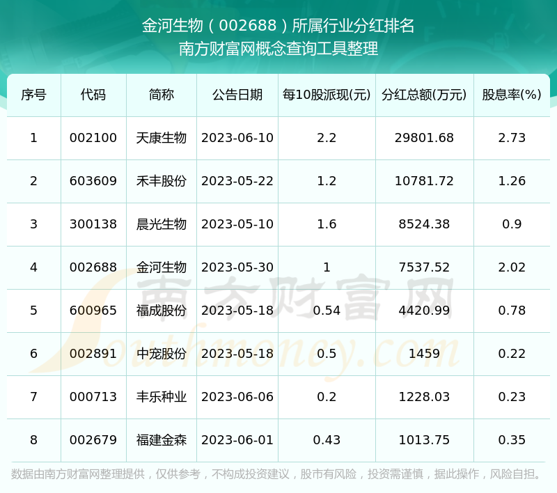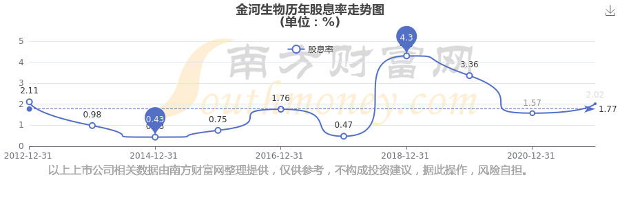 按照南方財富網(wǎng)趨勢選股系統(tǒng)統(tǒng)計,金河生物所屬行業(yè)為農(nóng)牧飼漁行業(yè),農(nóng)牧飼漁行業(yè)分紅排名情況如下表: