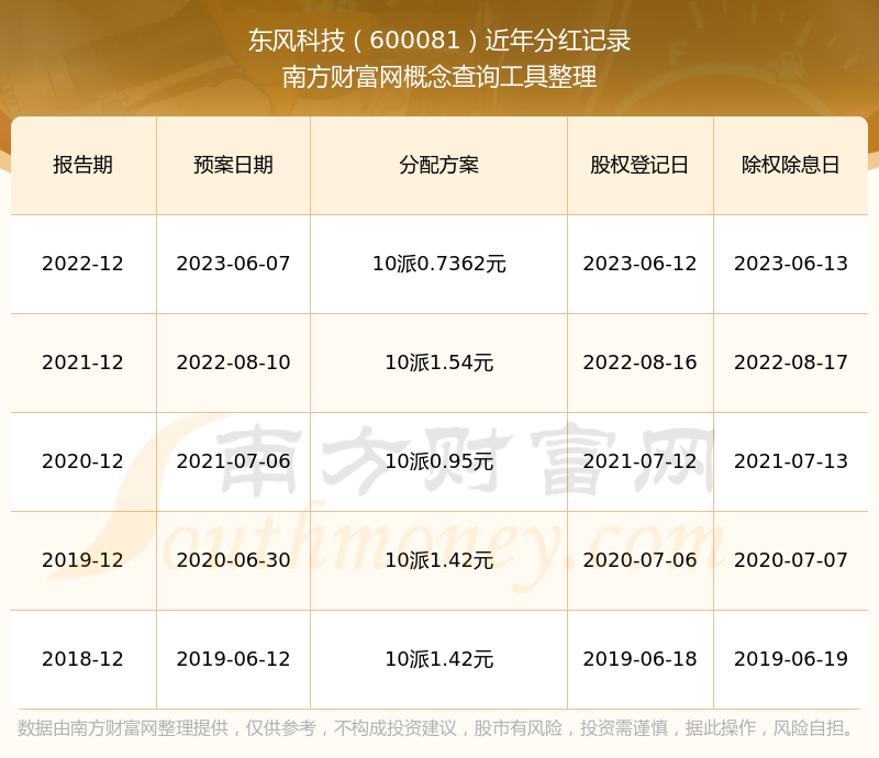東風(fēng)科技最新一次公布的分紅方案為10派0.7362元。本次權(quán)益分派股權(quán)登記日為2023年6月12日,除權(quán)除息日為2023年6月13日,派息日為2023年6月13日。