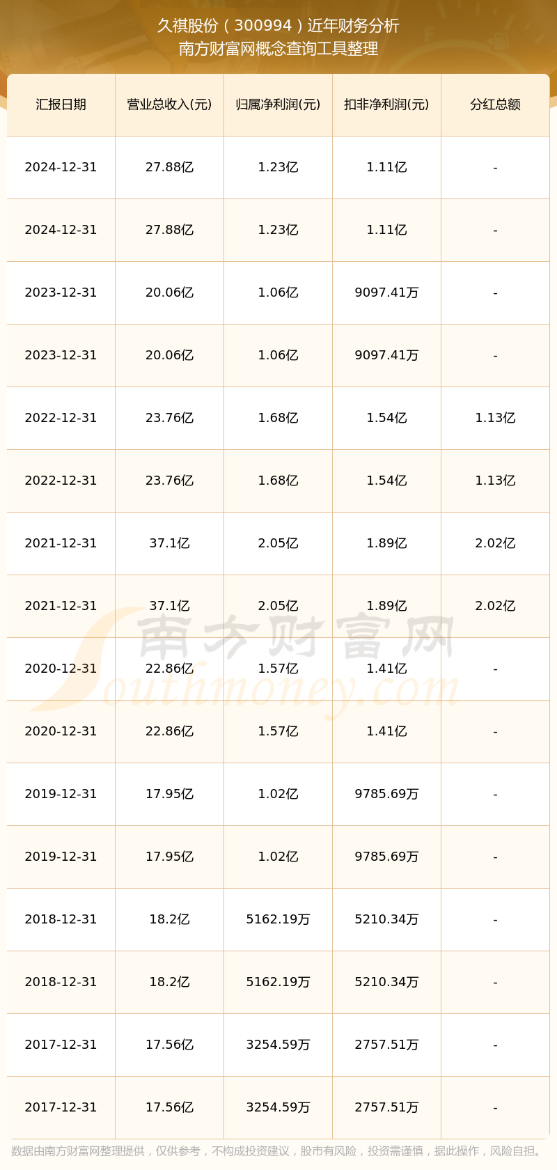 久祺股份歷年分紅派息情況如下表所示: