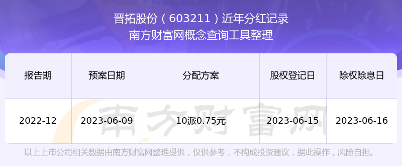 晉拓股份最新一次公布的分紅方案:10派0.75元。