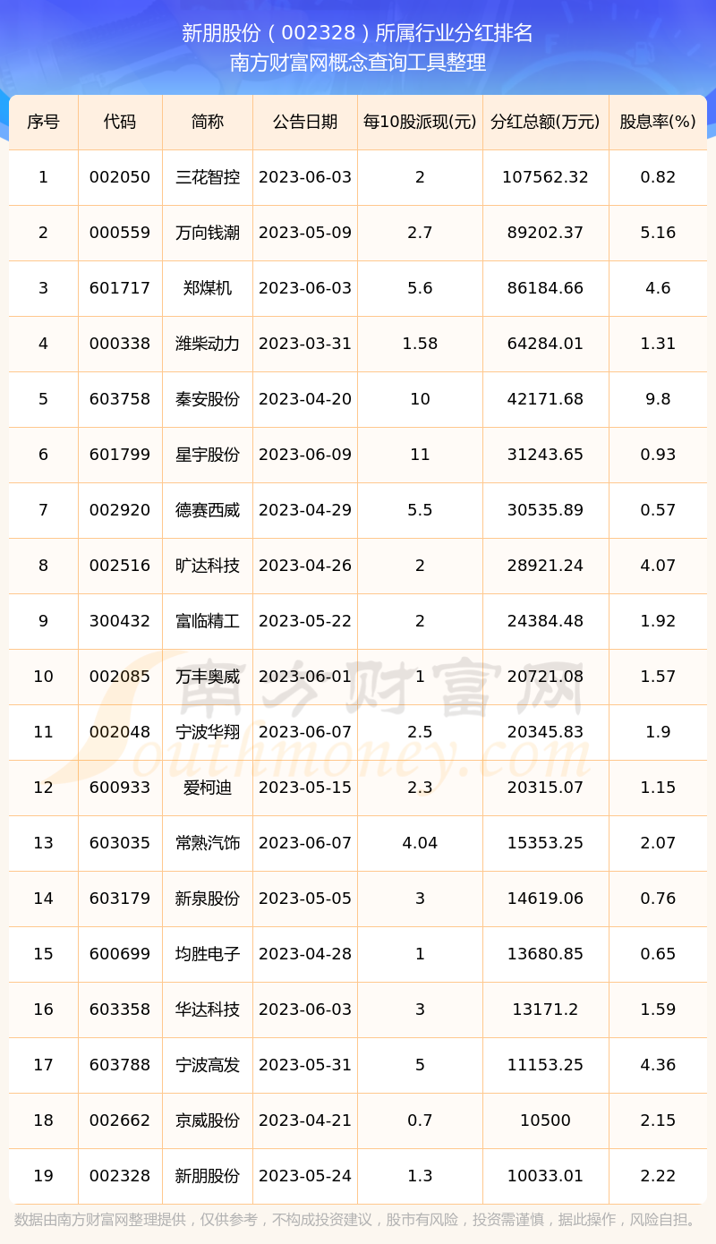 按照南方財(cái)富網(wǎng)趨勢(shì)選股系統(tǒng)統(tǒng)計(jì),新朋股份所屬行業(yè)為汽車零部件行業(yè),汽車零部件行業(yè)分紅排名情況如下表: