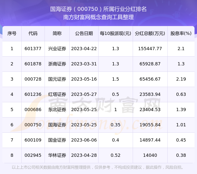 按照南方財(cái)富網(wǎng)趨勢選股系統(tǒng)統(tǒng)計(jì),國海證券所屬行業(yè)為證券行業(yè),證券行業(yè)分紅排名情況如下表: