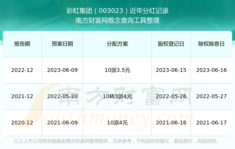 彩虹集團最新一次公布的分紅方案為10派3.5元。本次權(quán)益分派股權(quán)登記日為2023年6月15日,除權(quán)除息日為2023年6月16日,派息日為2023年6月16日。