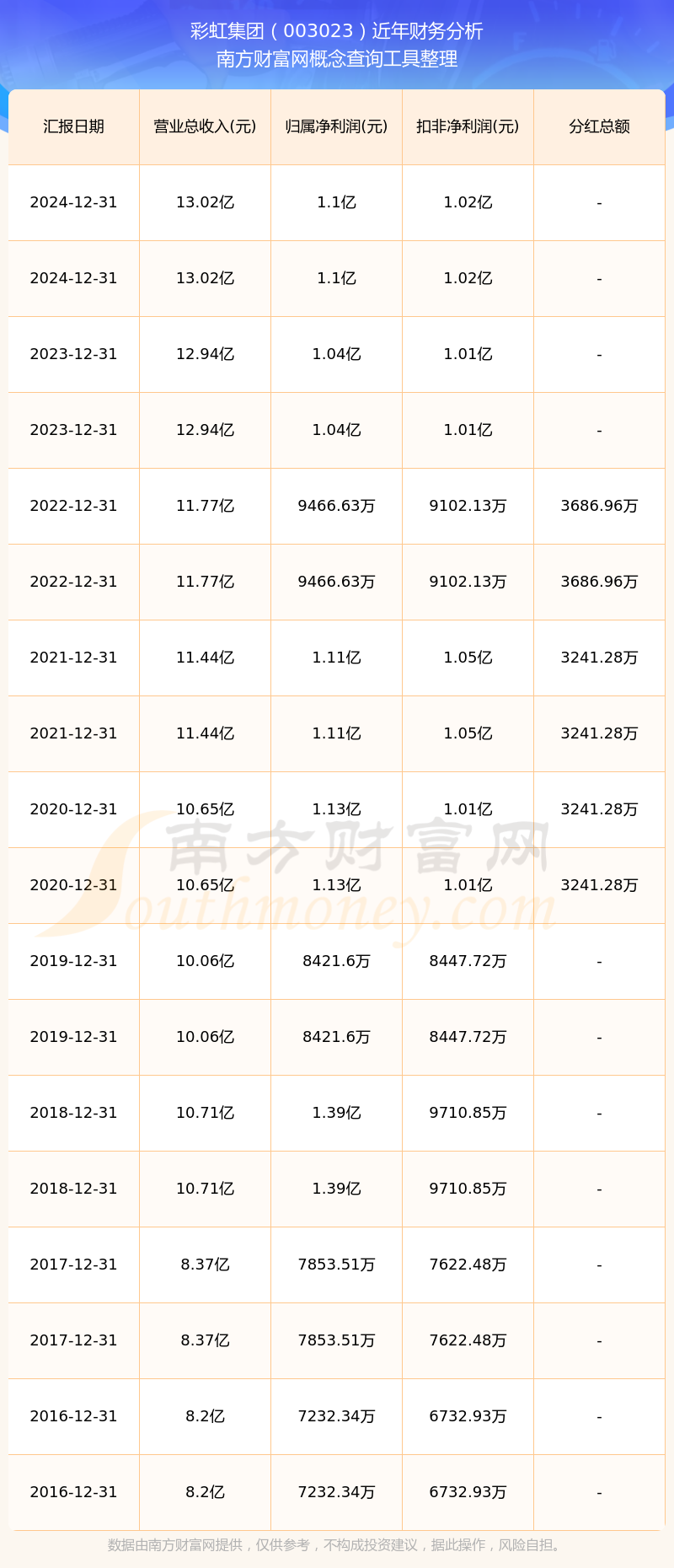彩虹集團2024年總營收13.02億,同比增長0.59%;凈利潤1.1億,同比增長5.41%;銷售毛利率43.36%。