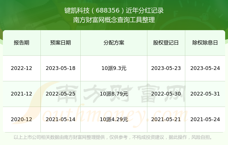 鍵凱科技最新一次公布的分紅方案為10派9.3元。本次權(quán)益分派股權(quán)登記日為2023年5月23日,除權(quán)除息日為2023年5月24日,派息日為2023年5月24日。