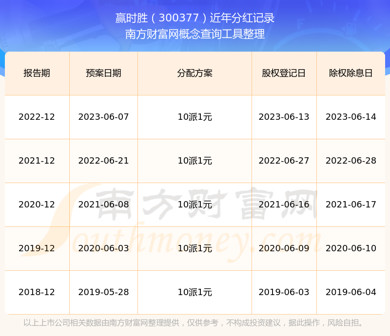 贏時(shí)勝最新一次公布的分紅方案為10派1元。本次權(quán)益分派股權(quán)登記日為2023年6月13日,除權(quán)除息日為2023年6月14日,派息日為2023年6月14日。