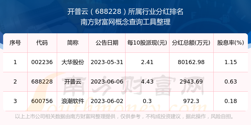 按照南方財(cái)富網(wǎng)趨勢選股系統(tǒng)統(tǒng)計(jì),開普云所屬行業(yè)為軟件行業(yè),軟件行業(yè)分紅排名情況如下表: