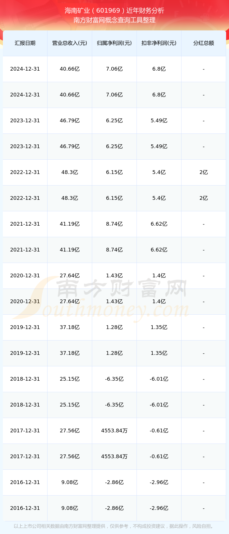 2024年海南礦業(yè)總營收40.66億,同比增長-13.11%;凈利潤7.06億,同比增長12.97%;銷售毛利率34.82%。