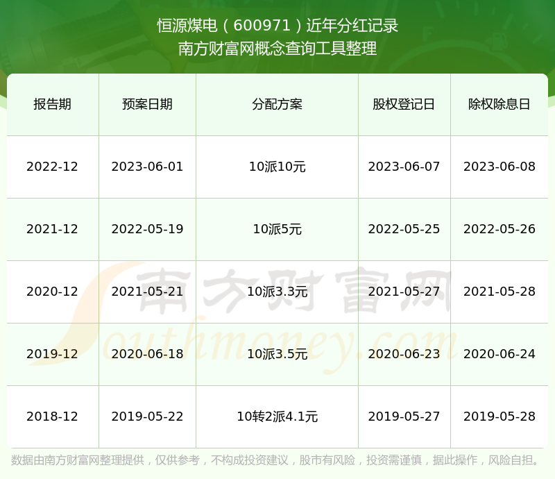 恒源煤電最新一次公布的分紅方案為10派10元。本次權(quán)益分派股權(quán)登記日為2023年6月7日,除權(quán)除息日為2023年6月8日,派息日為2023年6月8日。