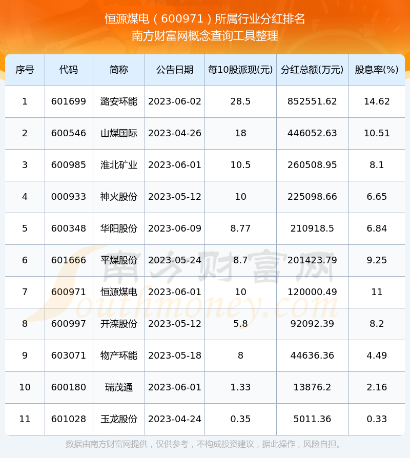 按照南方財(cái)富網(wǎng)趨勢選股系統(tǒng)統(tǒng)計(jì),恒源煤電所屬行業(yè)為煤炭行業(yè),煤炭行業(yè)分紅排名情況如下表: