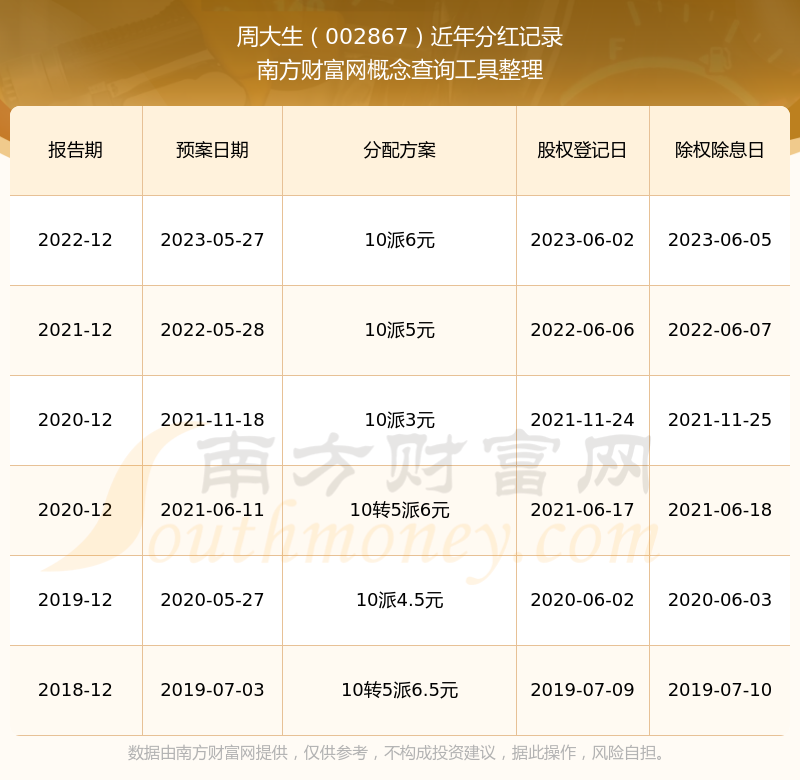 周大生最新一次公布的分紅方案:10派6元。