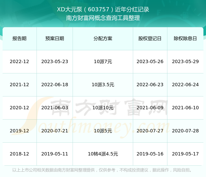 XD大元泵最新一次公布的分紅方案為10派7元。本次權(quán)益分派股權(quán)登記日為2023年5月26日,除權(quán)除息日為2023年5月29日,派息日為2023年5月29日。