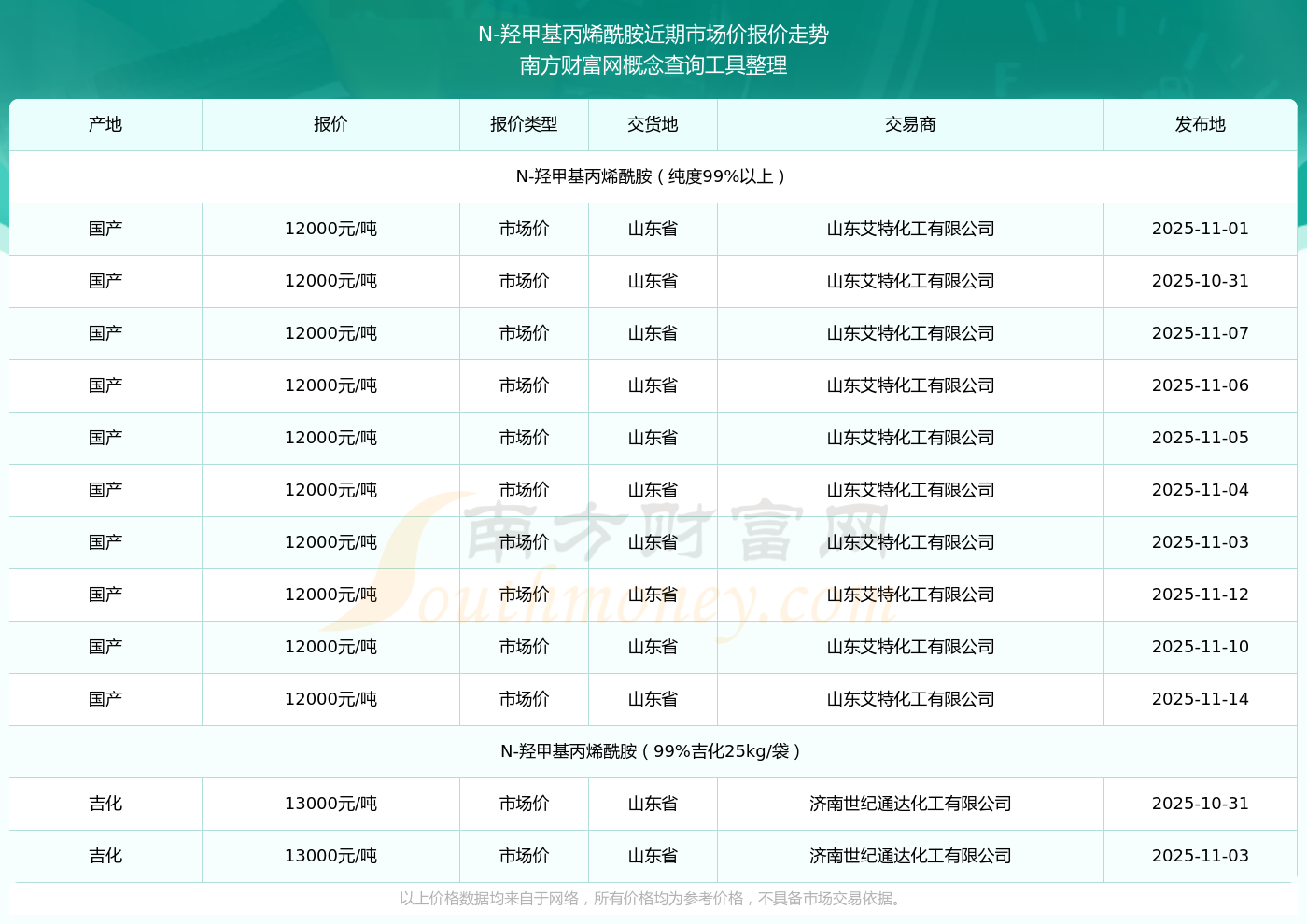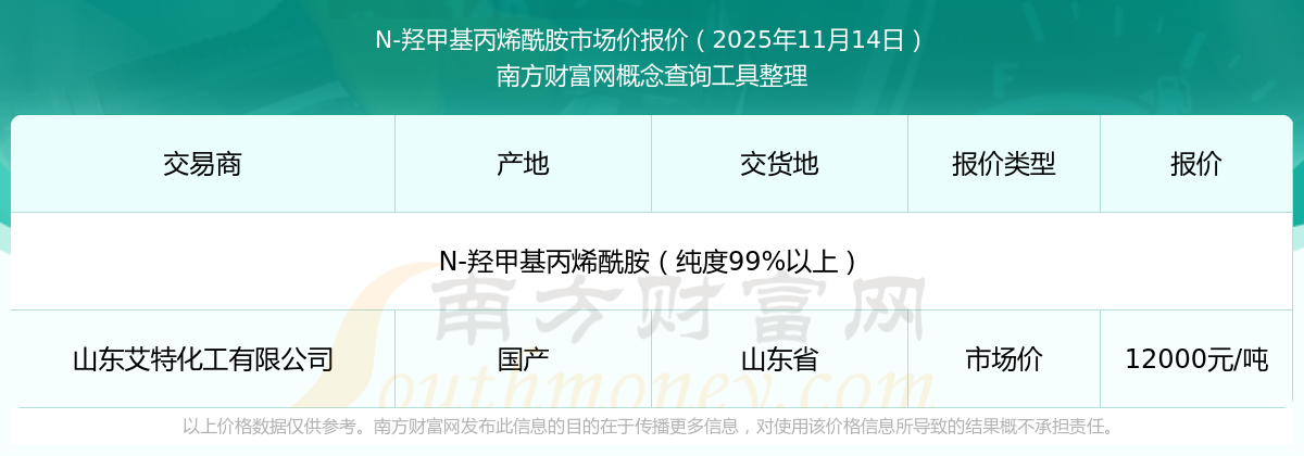 2025年11月14日,N-羥甲基丙烯酰胺(純度99%以上)市場價價格為12000.00元/噸,報價人:山東艾特化工有限公司,交易地點為山東省。