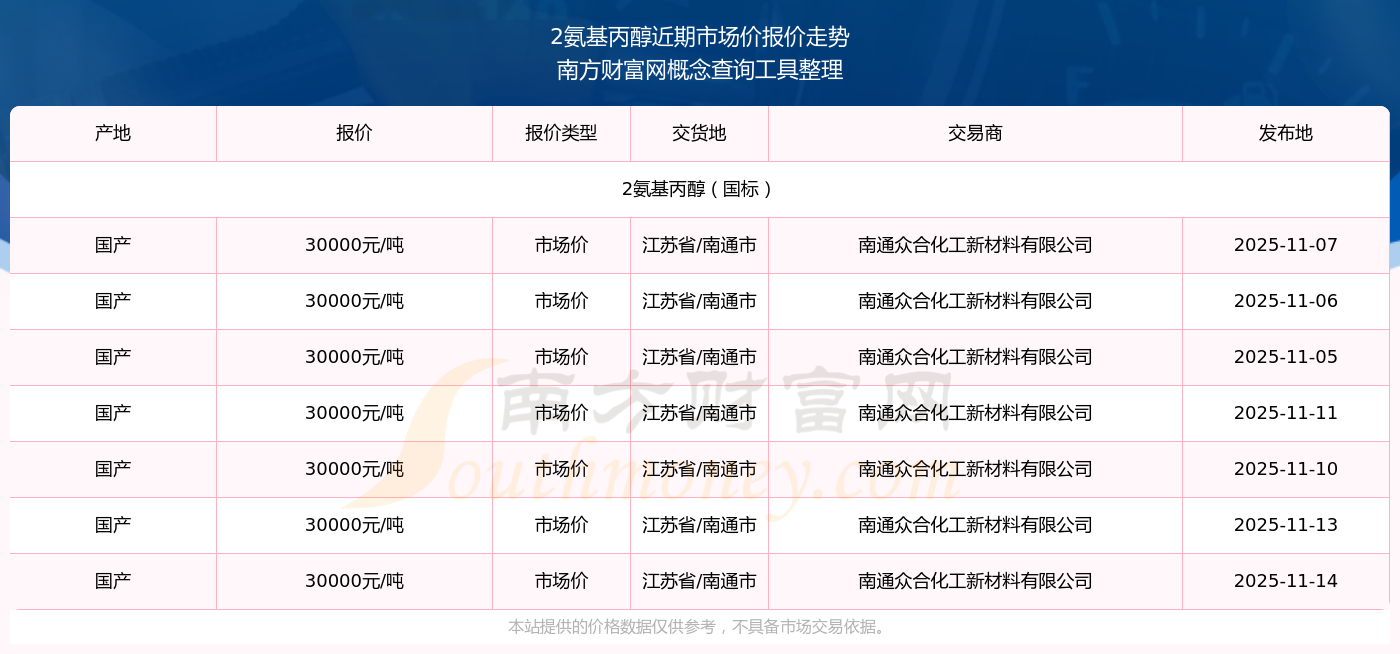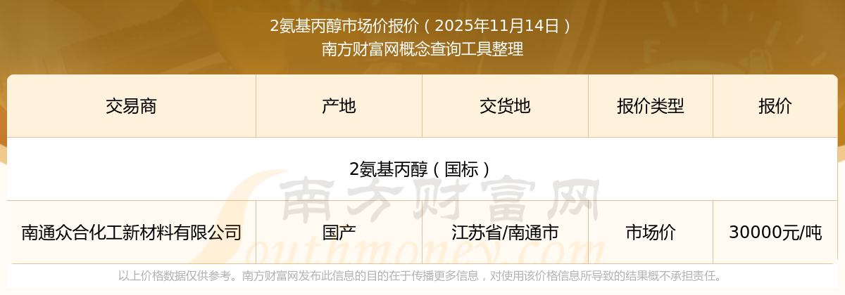 2025年11月14日,2氨基丙醇(國標)市場價價格為30000.00元/噸,報價人:南通眾合化工新材料有限公司,交易地點為江蘇省/南通市。