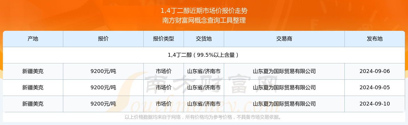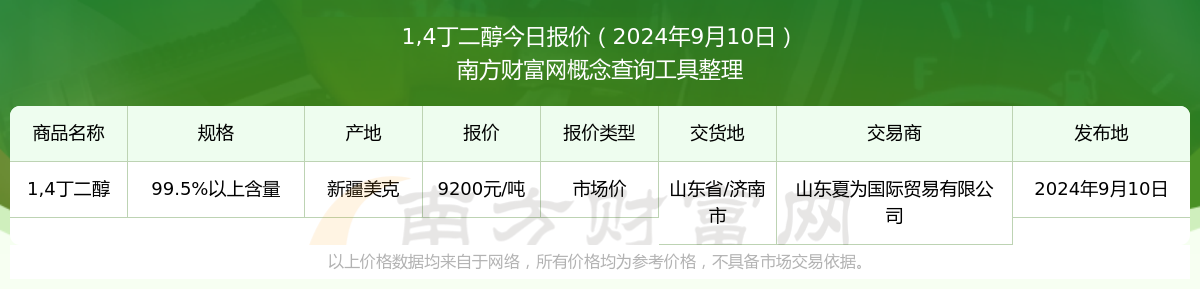 2024年9月10日,1,4丁二醇(99.5%以上含量)市場價價格為9200.00元/噸,報價人:山東夏為國際貿(mào)易有限公司,交易地點為山東省/濟南市。