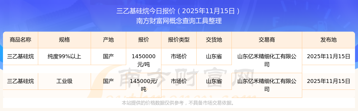 2025年11月15日,三乙基硅烷(工業(yè)級)市場價價格為145000.00元/噸,報價人:山東億禾精細化工有限公司,交易地點為山東省。